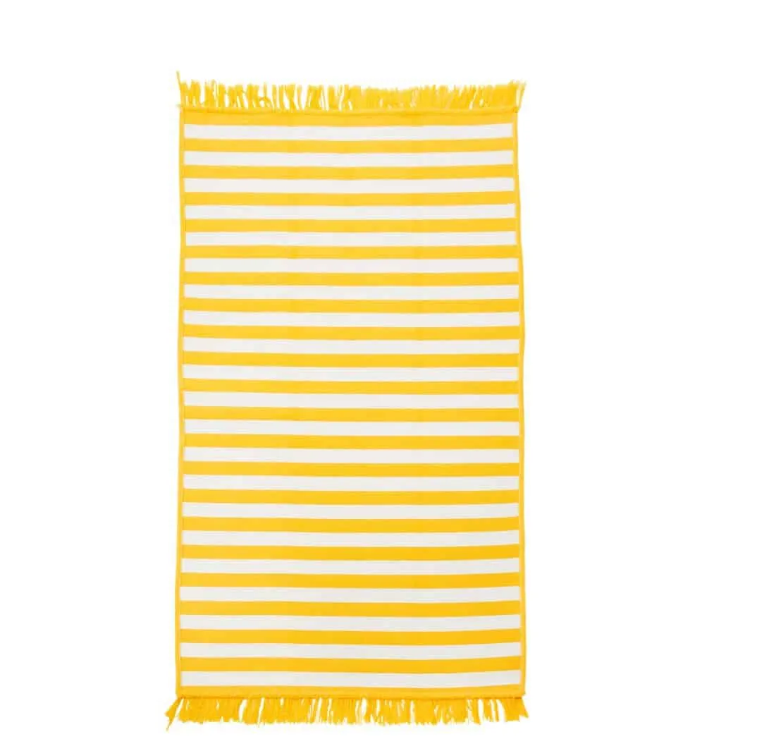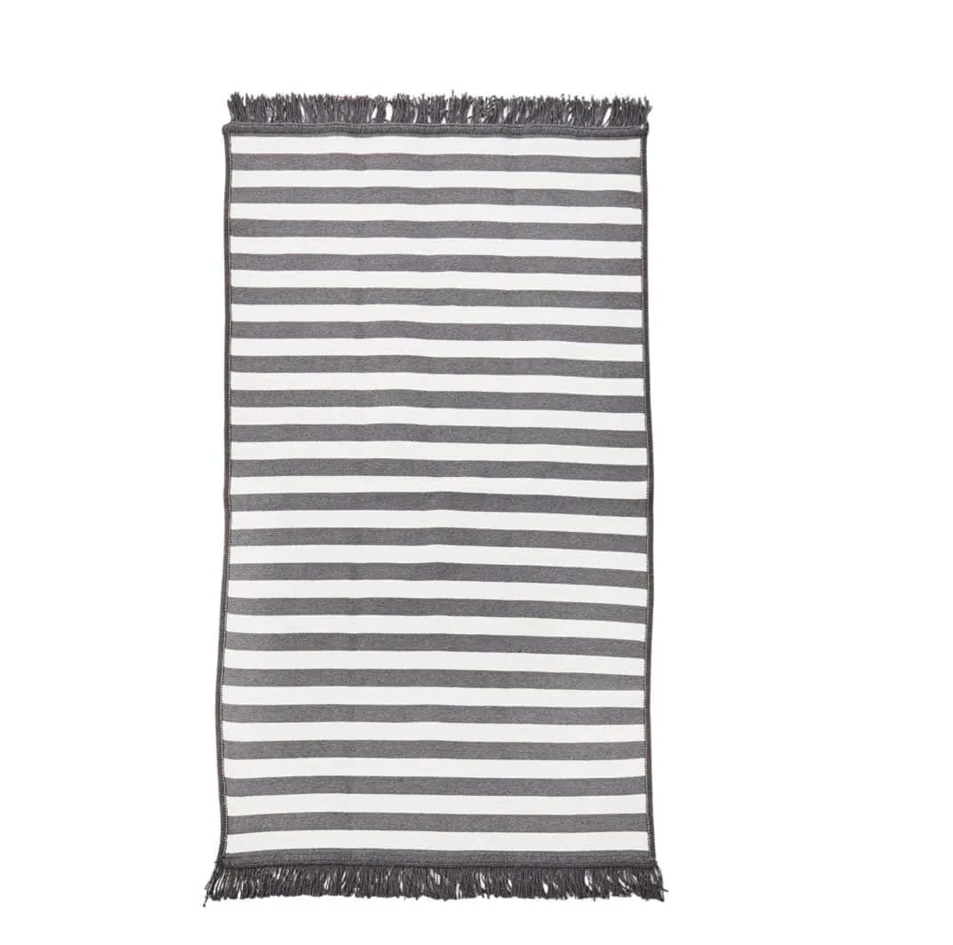Schicker, wetterfester Teppich, der völlig neue Akzente setzt. Die schicken Streifen und die offen Fransen machen den Teppich zu einem echten Hingucker im Haus oder auf der Terrasse. Die Materialzusammensetzung aus Polyacryl, Baumwolle und Polyester macht den Teppich UV-beständig, wasserbeständig, chlorbeständig, langlebig und farbecht.