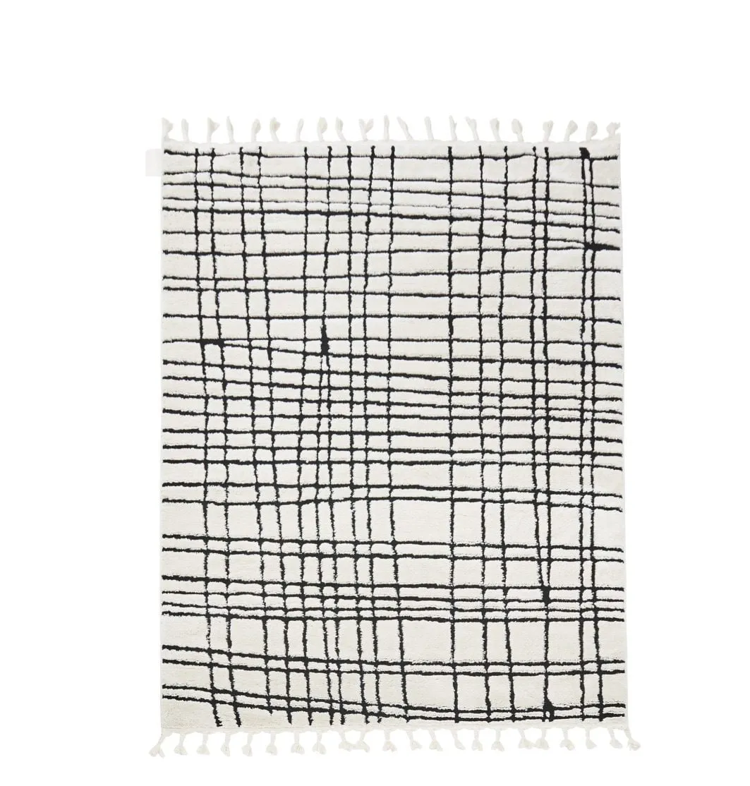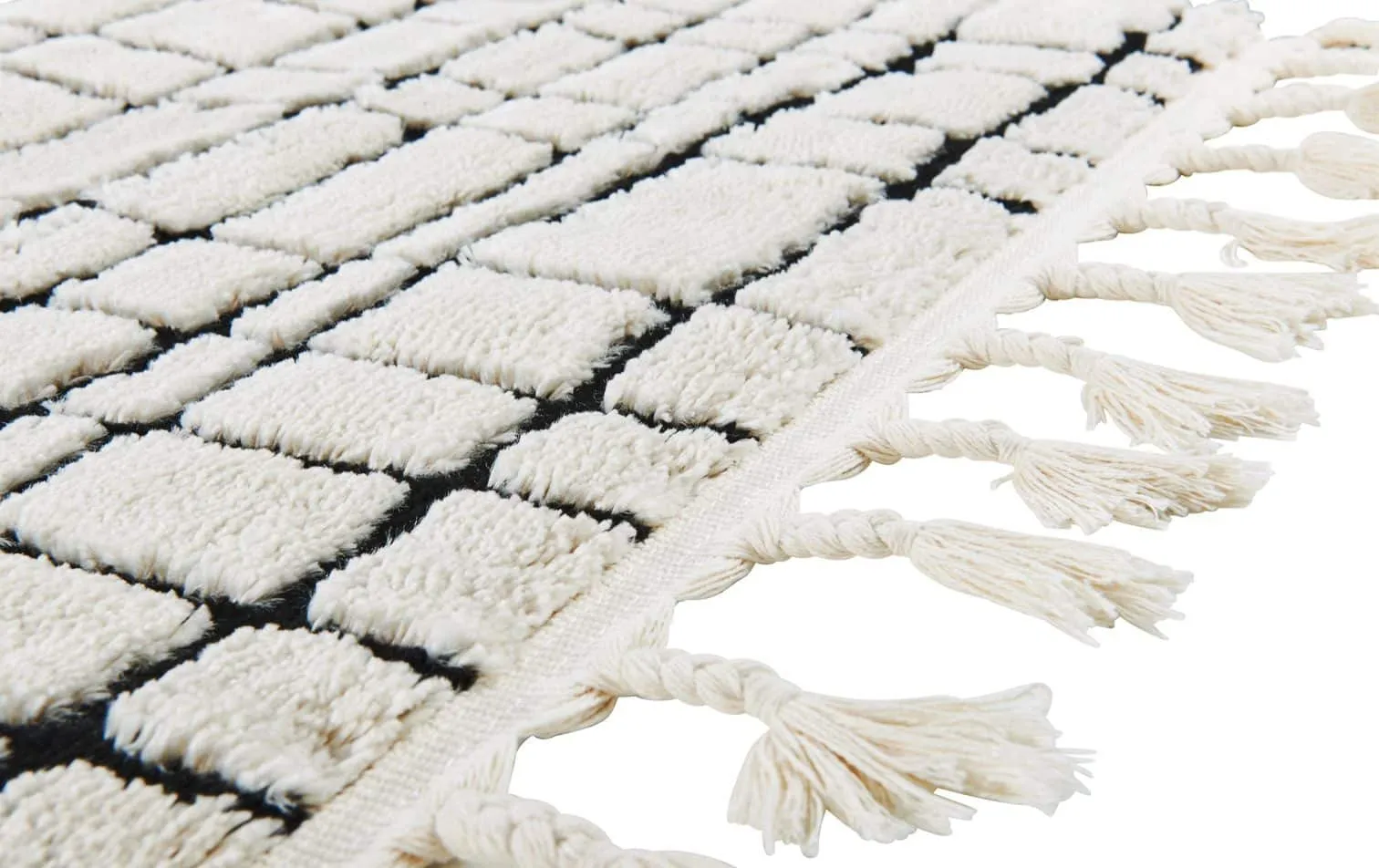 Teppich im Scandi Boho-Style mit verspielten, geflochtenen Fransen an den kurzen Seiten. Facettenreich und kontrastreich für ein gemütliches Wohnen. Der Teppich ist modern und schlicht gehalten in zartem Off-White mit schwarzem Muster. Er versprüht eine tolle Natürlichkeit und schafft eine warme Atmosphäre für eine Extraportion Gemütlichkeit.