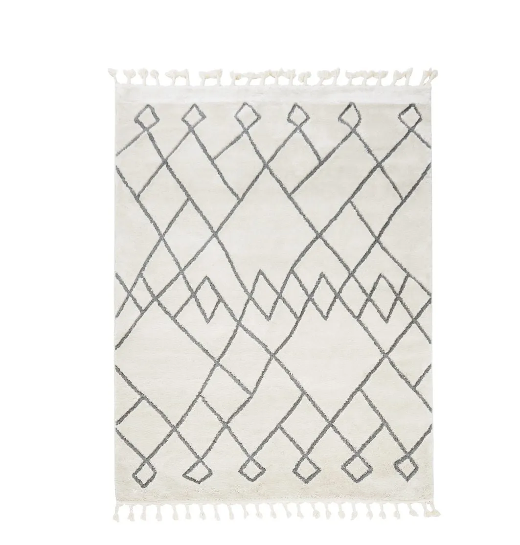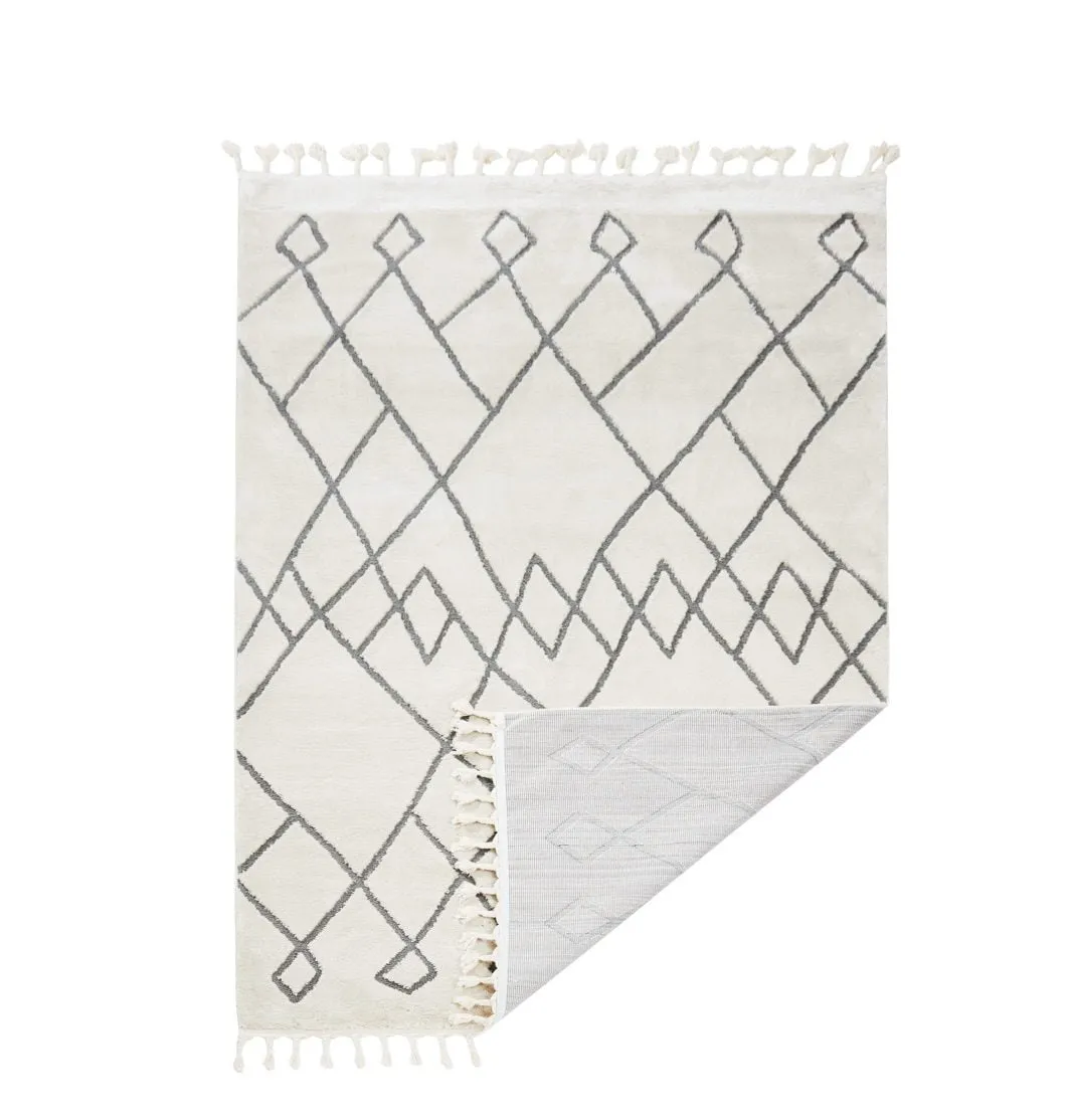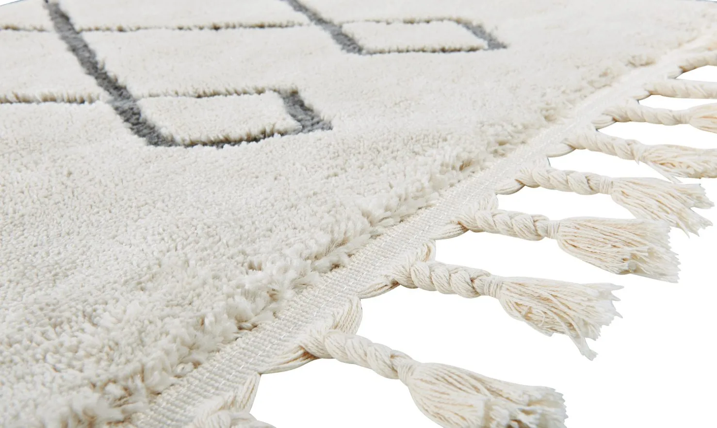 Teppich im Scandi Boho-Style mit verspielten, geflochtenen Fransen an den kurzen Seiten. Facettenreich und kontrastreich für ein gemütliches Wohnen. Der Teppich ist modern und schlicht gehalten in zartem Off-White mit schwarzem Muster. Er versprüht eine tolle Natürlichkeit und schafft eine warme Atmosphäre für eine Extraportion Gemütlichkeit.